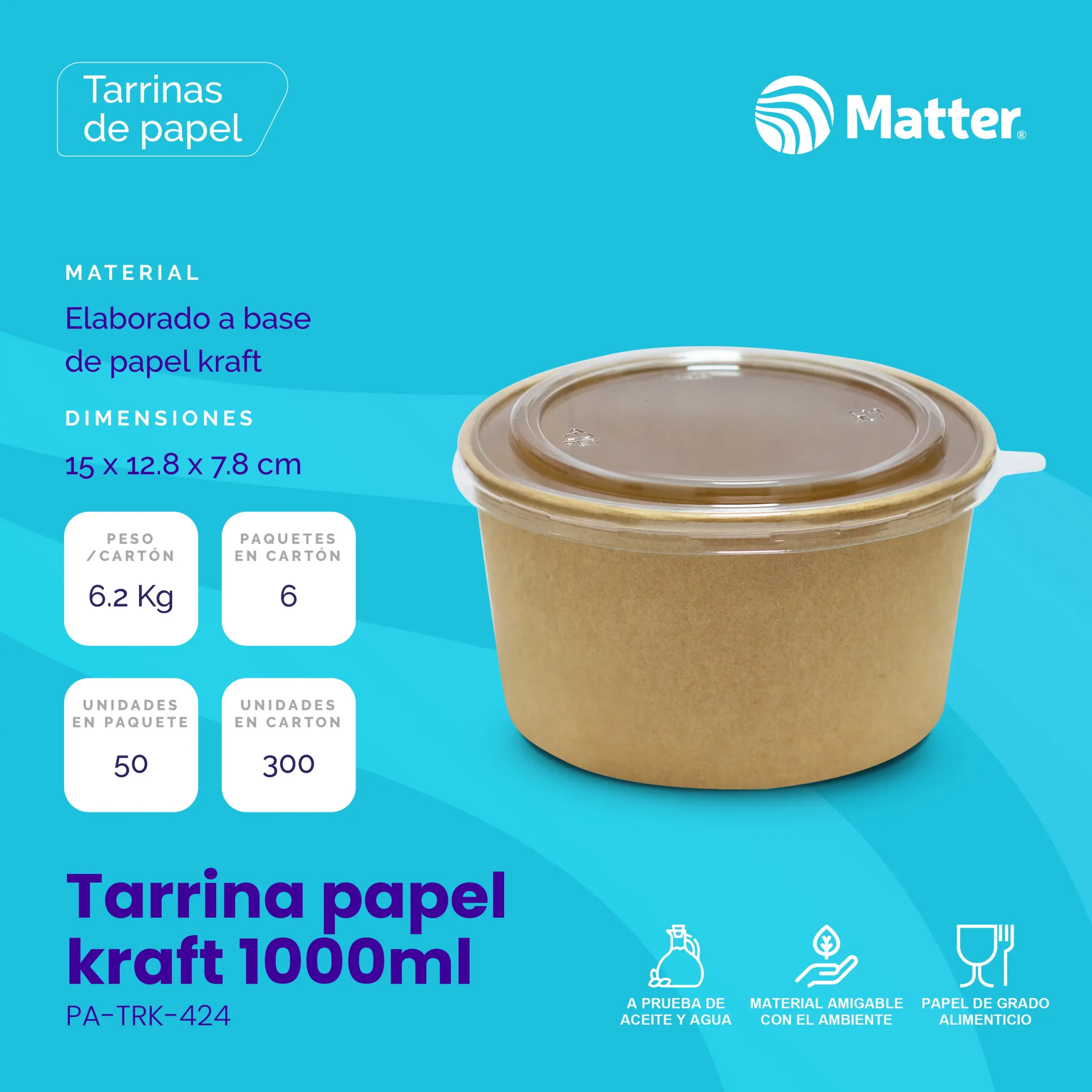 La tarrina de papel kraft de 1000 ml es ideal para porciones generosas de alimentos fríos o calientes como pastas, arroces, ensaladas o guisos. Fabricada con materiales sostenibles, combina resistencia y compromiso ambiental, siendo perfecta para negocios de comida para llevar, catering o delivery consciente.